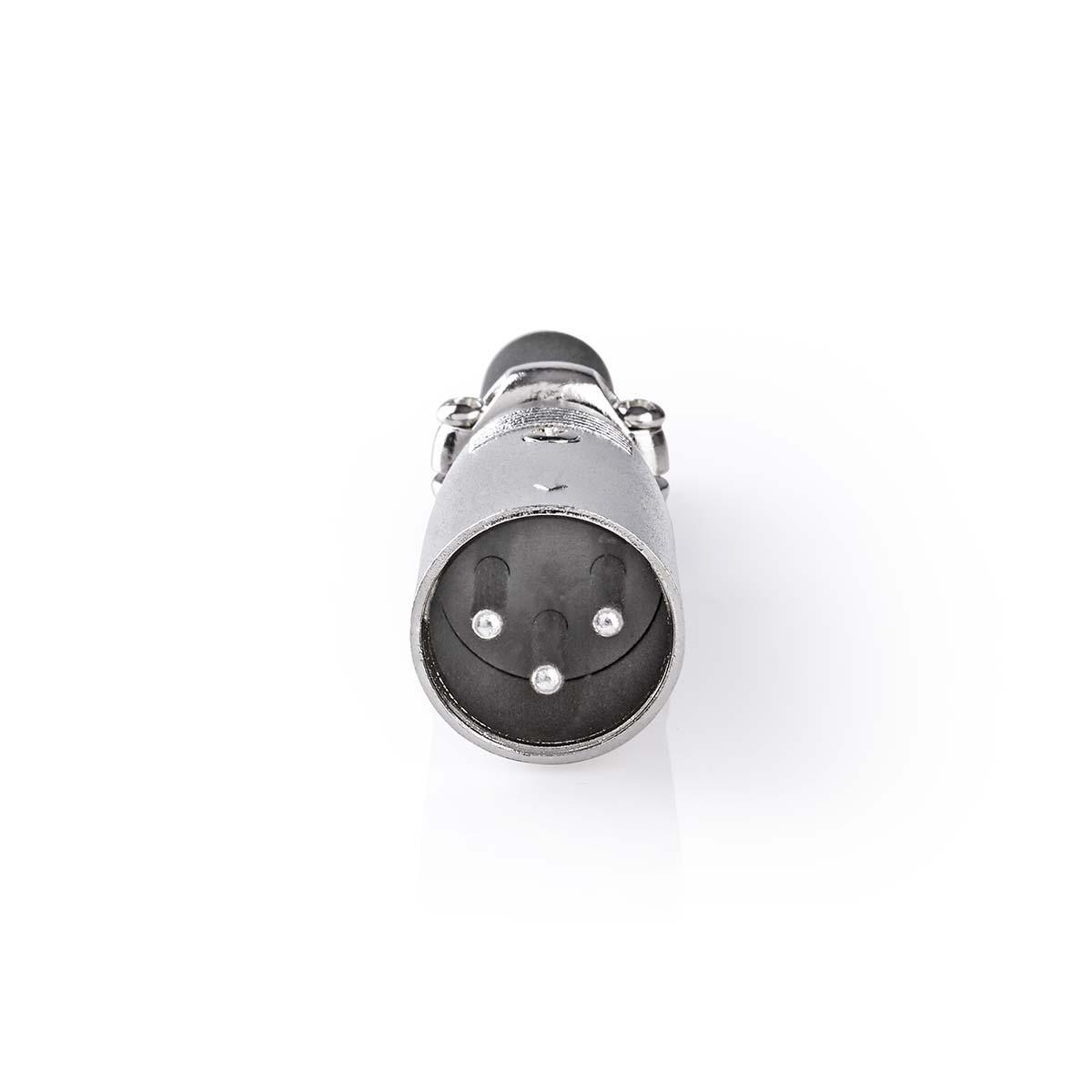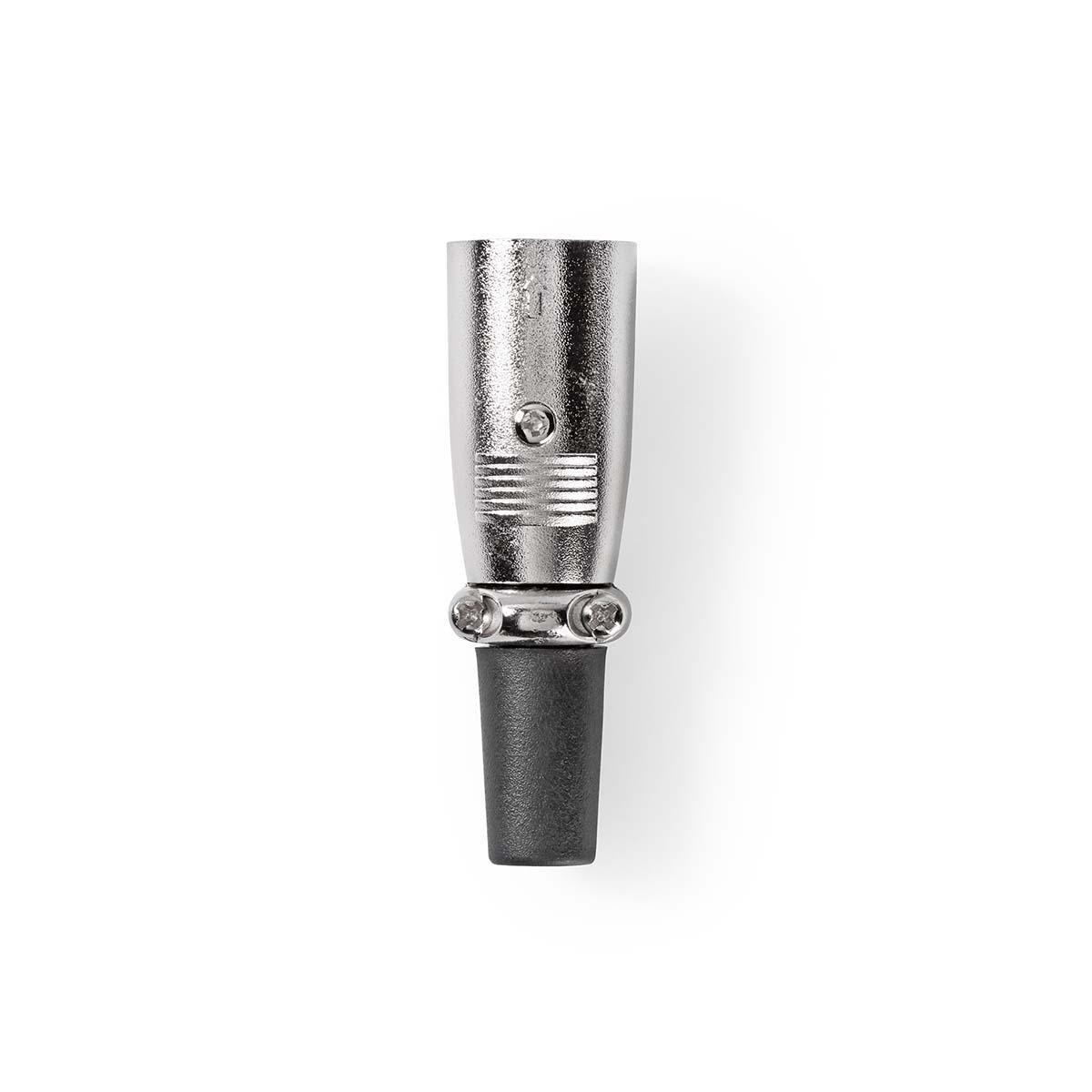 Connettore XLR maschio a 3 poli. Corpo in metallo nero e contatti argentati.
