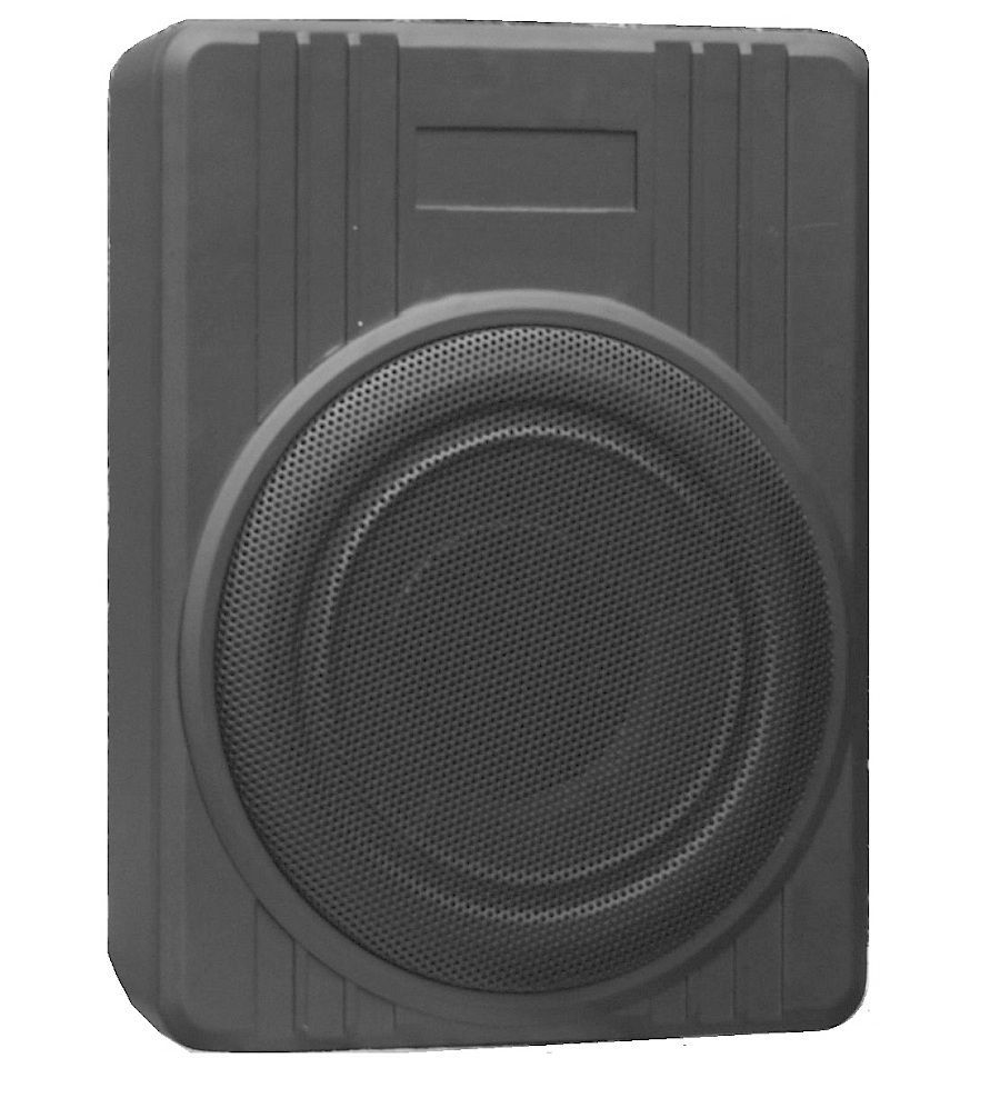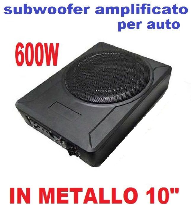 Subwoofer amplificato 26 Cm in metallo pressofuso ideale per installazione sotto i sedili, dotato di autoaccensione.