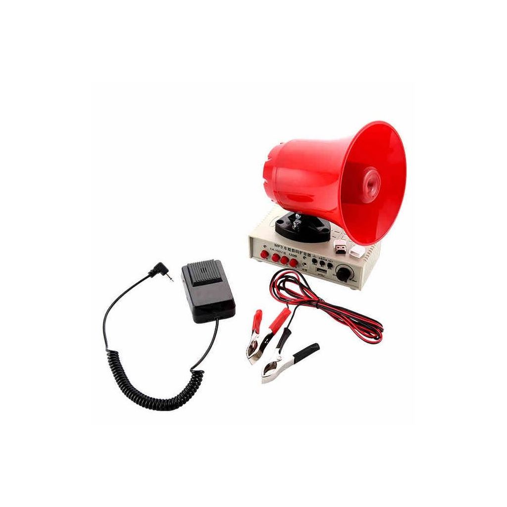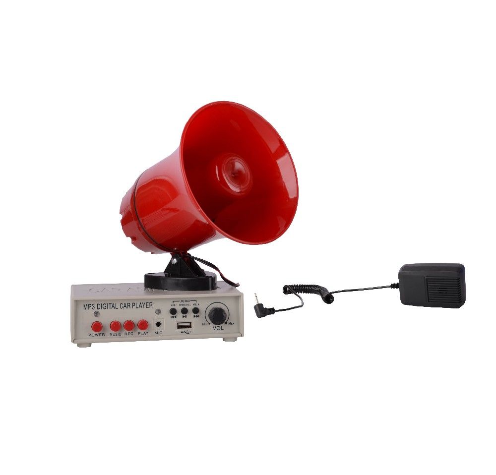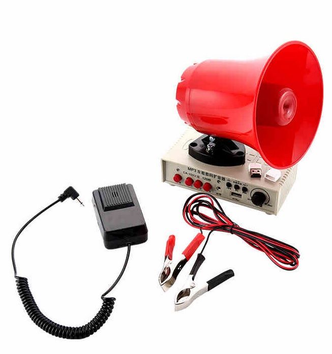 kit per annunci a ripetizione, ideale per essere istallato su auto, camioncini etc. E' composto da megafono da fissare sul veicolo grazie alle tre calamite collocate sulla base e poi collegarlo all' amplificatore/registratore a cui va collegato il microfono che può essere utilizzato per annunci o registrazioni degli annunci. Per il suo corretto funzionamento il kit include nella confezione anche una coppia di morsetti da collegare alla batteria del veicolo. L'amplificatore ha una rotella di regolazione di volume e 3 pulsanti per il funzionamento dell'audio in modo da trasmettere l'annuncio in real time o registrarlo e riprodurlo. E' dotato ancora di porta USB.